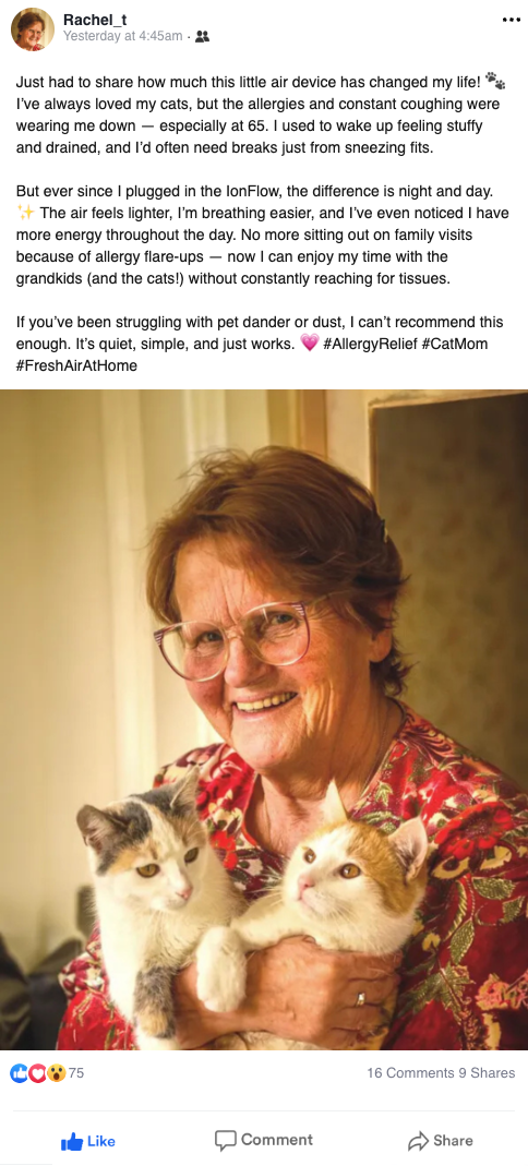 "I spent over $1,000 on purifiers, filters, medications, inhalers, and special bedding over five years," Margaret calculated. "IonFlow™ cost me less than a tank of petrol, and it actually worked."