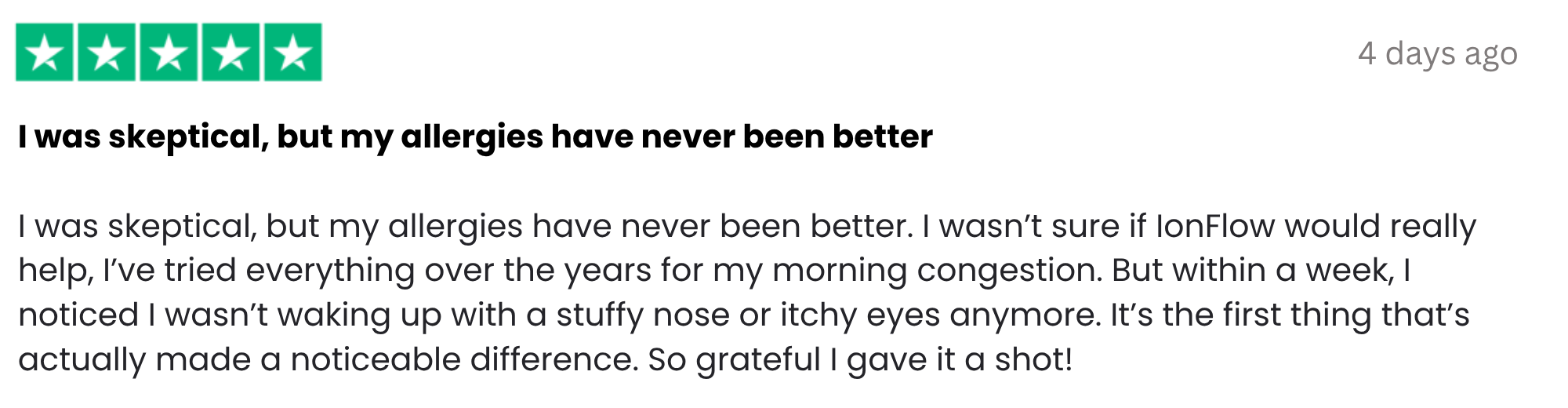 "I spent over $1,000 on purifiers, filters, medications, inhalers, and special bedding over five years," Julie calculated. "IonFlow™ cost me less than a tank of petrol, and it actually worked."