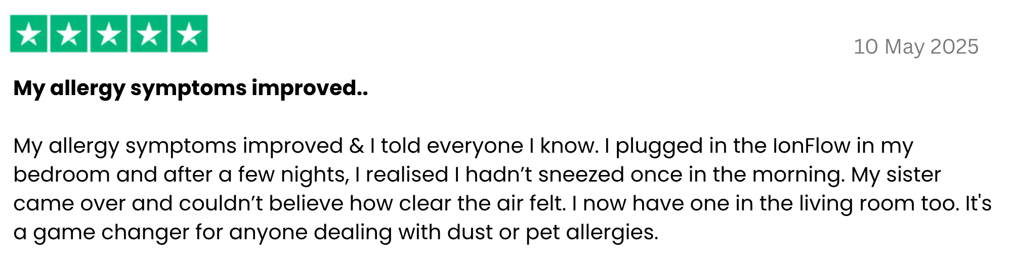 The negative ions from IonFlow™ were doing exactly what they were designed to do — attaching to dust mite proteins, pet dander, mould spores, and fine particles, causing them to clump together and fall out of her breathing space.