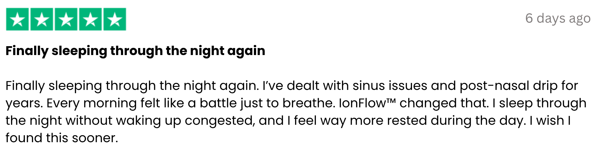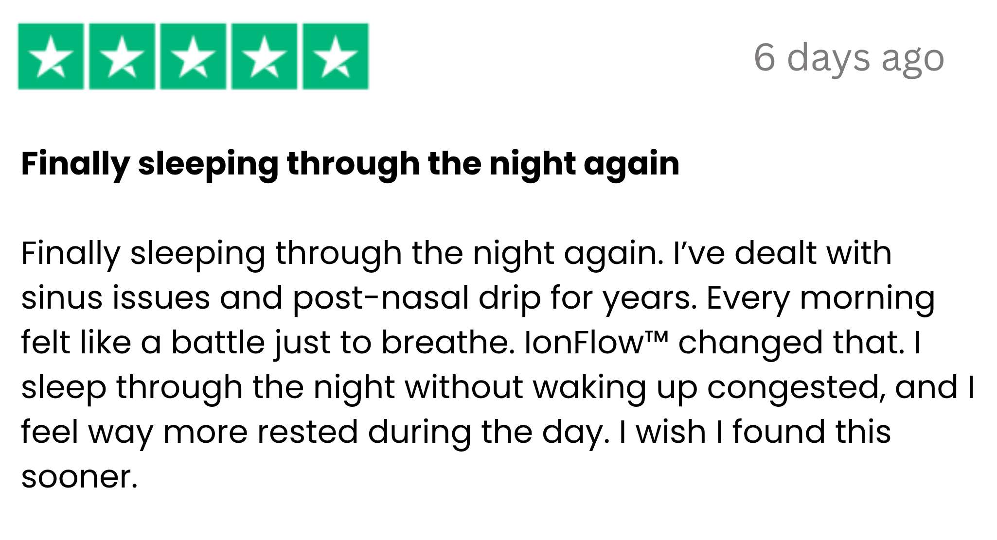 "I'm 72, not 92," she said. "I shouldn't have to accept waking up coughing every night as 'just part of aging.' IonFlow™ gave me back my sleep — and with that, everything else fell into place."